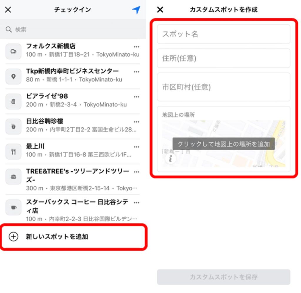 まず、Facebookアプリで「チェックイン」を使用して新しいスポットを作成します。